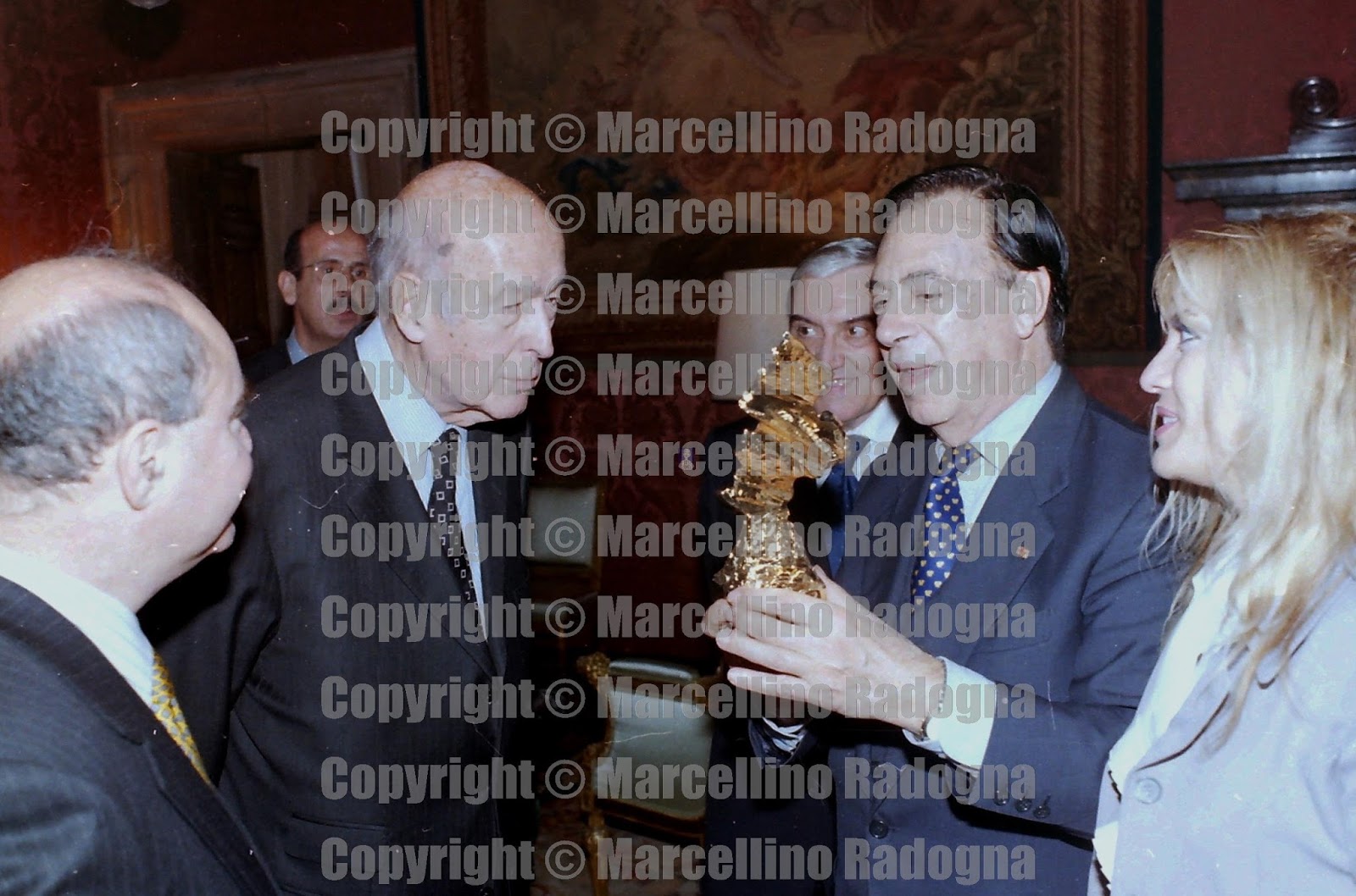 Archivio storico contemporaneo di Marcellino Fernando Rodogna, fotografo in Roma marcellinofoto@gmail.com . – Valery Giscard d’Estaing, già presiedente della Repubblica Francese, riceve a Palazzo Farnese il premio “Capo Circeo” da Gino Ragno.La leggenda narra che Enea fuggendo da Troia approdò sulle coste Laziali proprio a Capo Circeo,dove sposò Lavinia figlia di Fauno, re dei Latini.Roma 28 novembre 2003